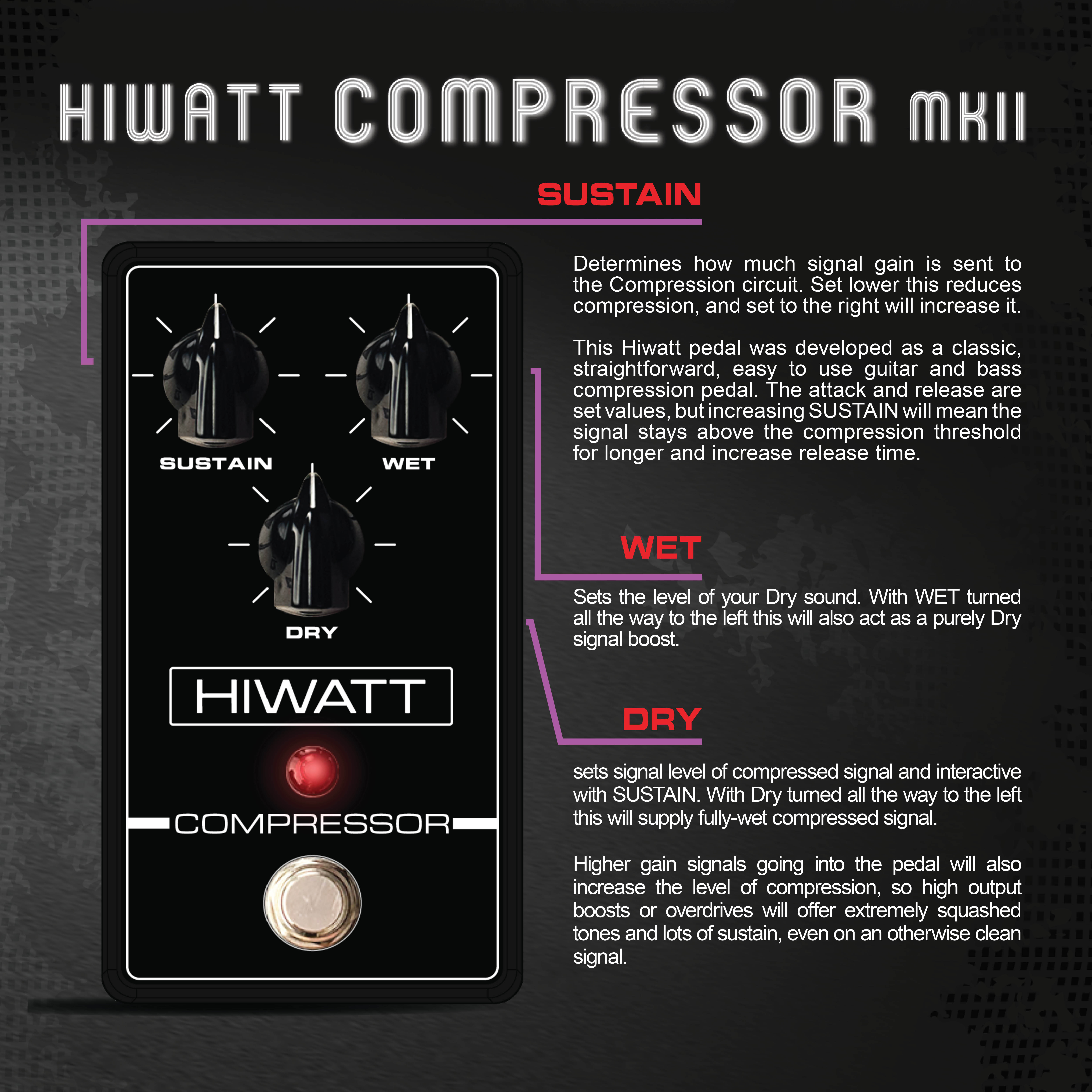 Simple and intuitive optical compressor with classic Hiwatt retro styling for chicken-picking squash, long sustain, and clean boost.