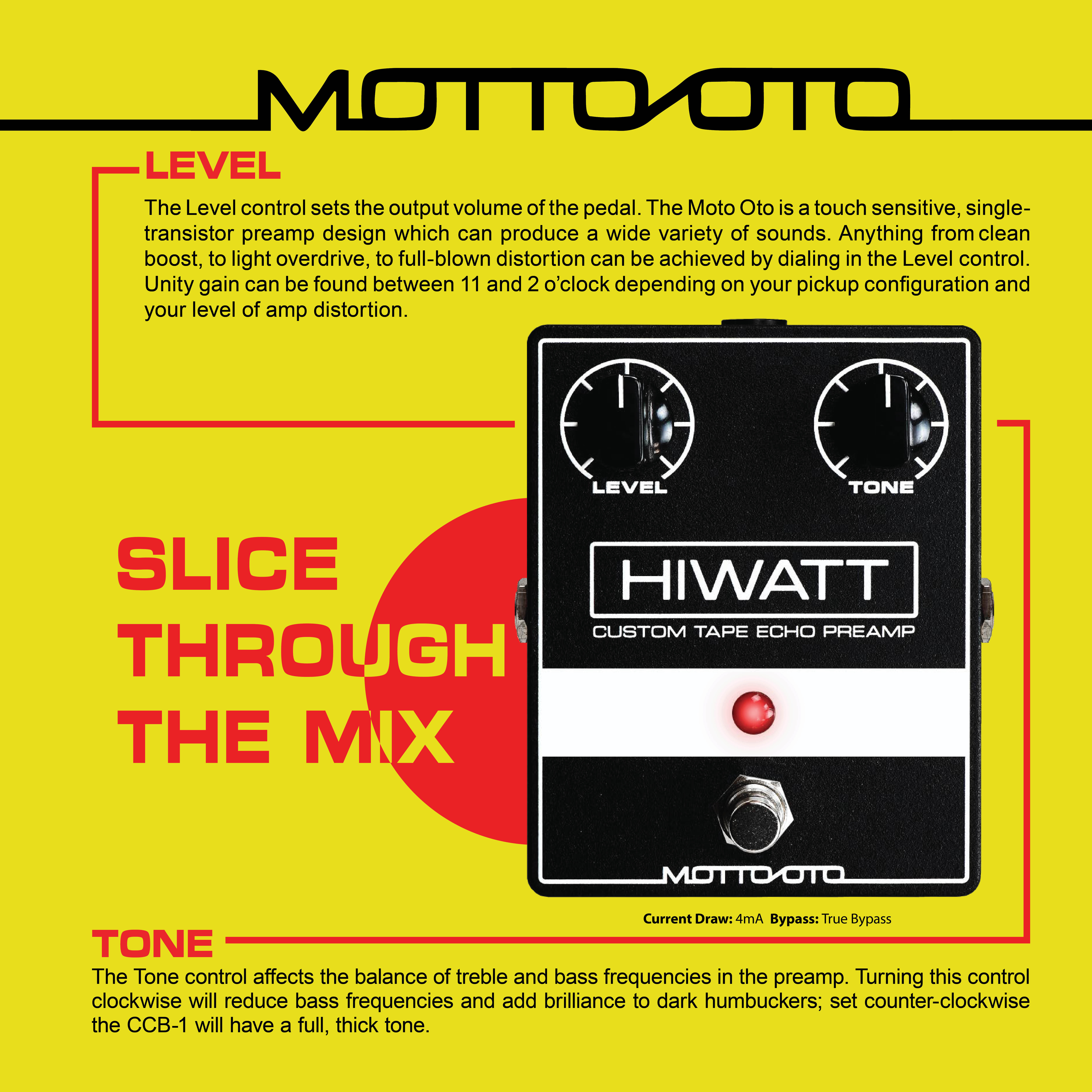 The Motto Oto preamp is not your typical boost pedal. Touch sensitive and very dynamic; placed in the proper hands this sonic blade is a joy to wield.