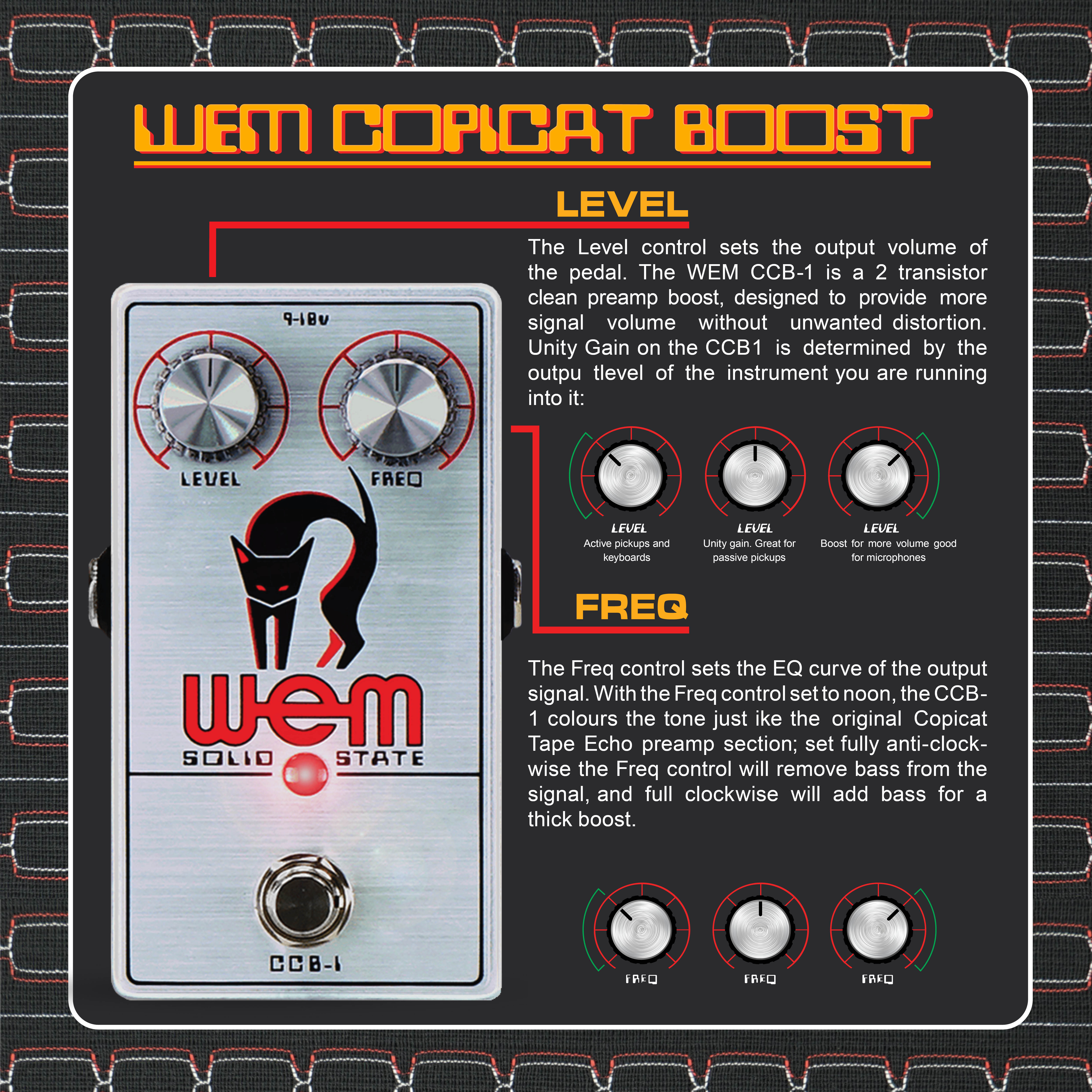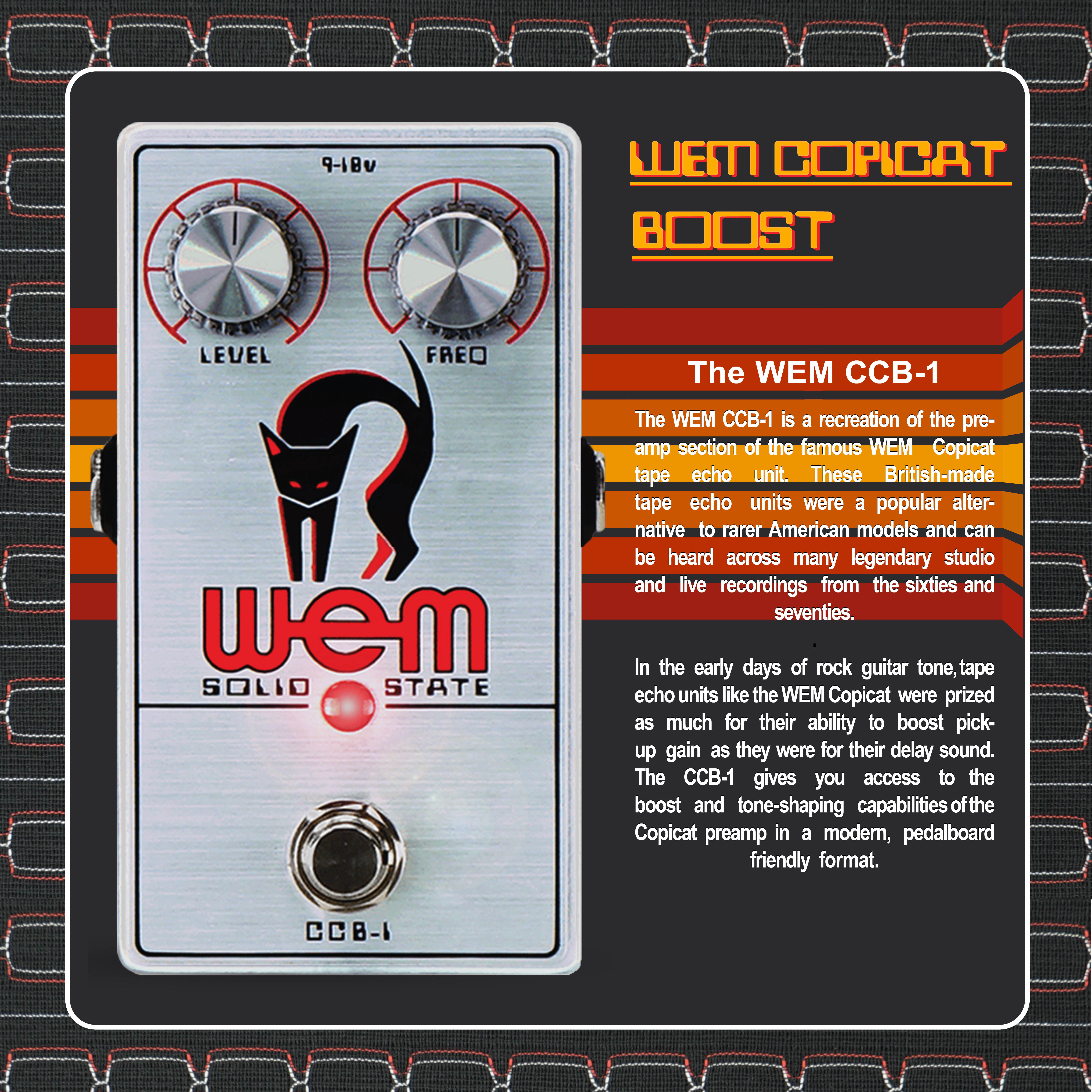 The WEM CCB-1 is a recreation of the preamp section of the famous WEM Copicat tape echo unit. These British made tape echos were a popular alternative to rarer American models and can be heard across many legendary studio and live recordings from the sixties and seventies - the CCB-1 gives you access to the boost and tone-shaping capabilities of the Copicat preamp in a modern, convenient format.