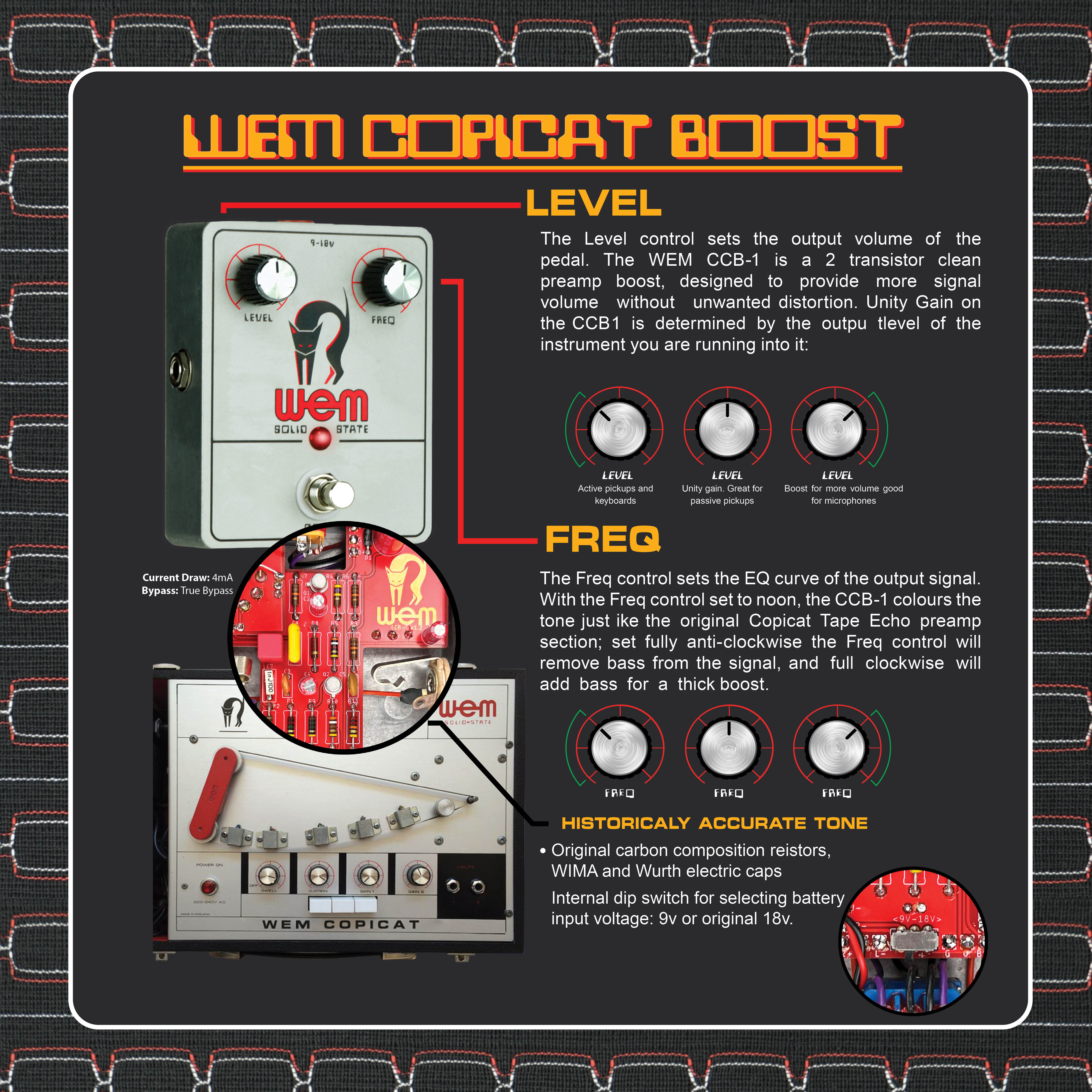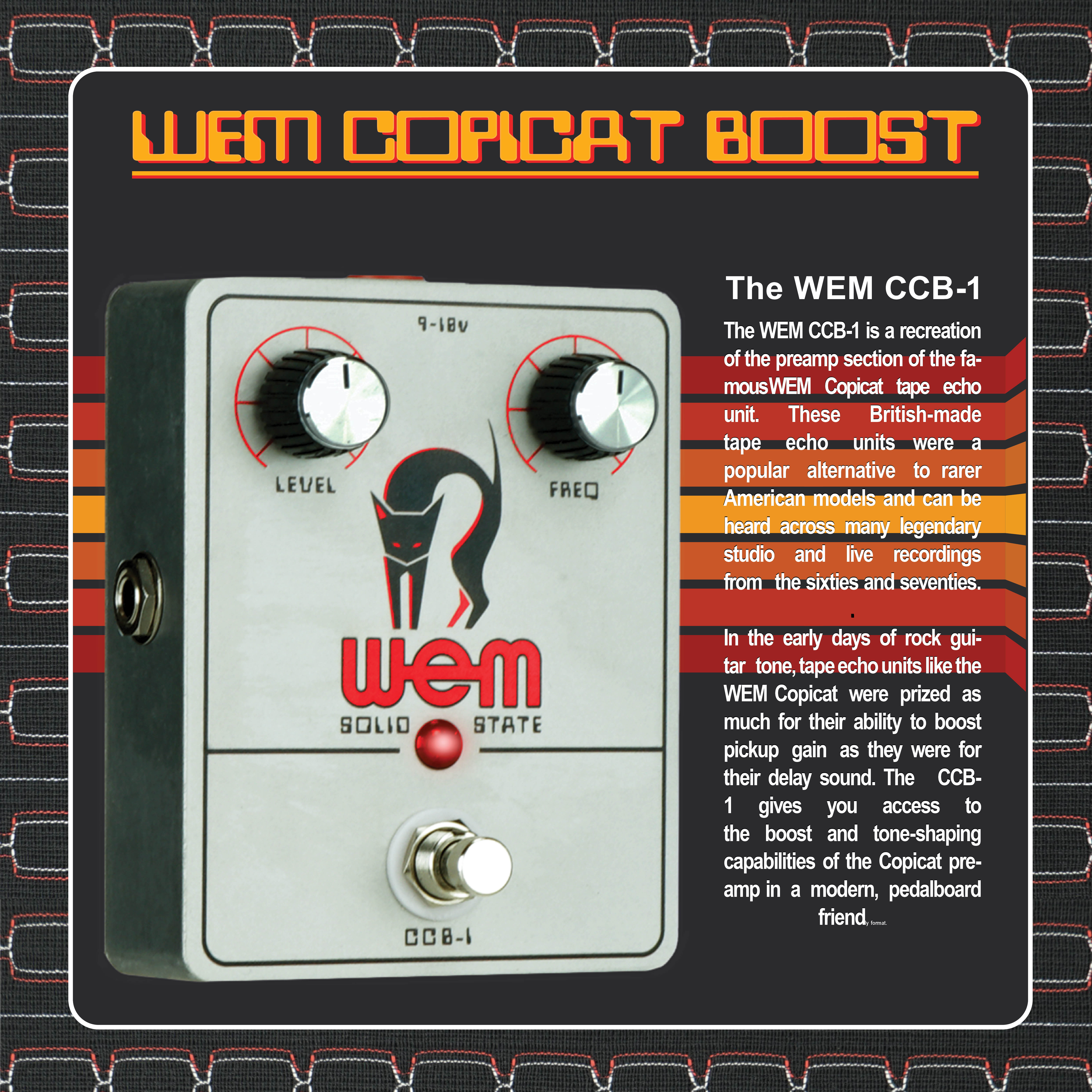 Handwired in the Custom Workshops in Doncaster, England, the WEM CCB-1 is a recreation of the preamp section of the famous WEM Copicat tape echo unit. These British made tape echos were a popular alternative to rarer American models and can be heard across many legendary studio and live recordings from the sixties and seventies - the CCB-1 gives you access to the boost and tone-shaping capabilities of the Copicat preamp in a modern, convenient format.